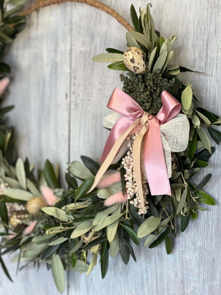Bringen Sie sanfte Eleganz in Ihr Zuhause. Dieser handgefertigte Kranz vereint zarte Rosatöne mit dem natürlichen Grün von Olivenblättern und dezenten Deke-Ostereiern. Ein stilvolles Statement-Piece, das Tradition und modernen Charme verbindet.